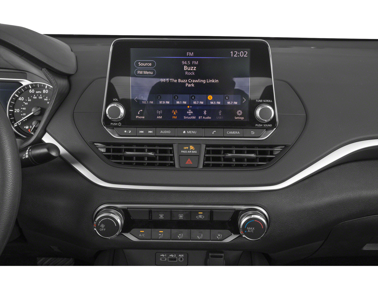 - Radio: AM/FM Audio System -inc: 6 speakers, aux input, NissanConnect featuring Apple CarPlay, Android Auto, 8" color touch-screen display, 1 front illuminated USB port (type-C) for compatible devices, SiriusXM radio w/advanced audio features, Bluetooth® hands-free phone system, streaming audio via Bluetooth®, hands-free text messaging assistant, 2 rear illuminated USB ports (type-A, 1 type-C) for compatible devices, Siri Eyes Free and Google Assistant voice recognition